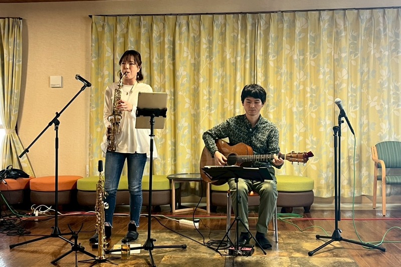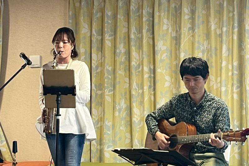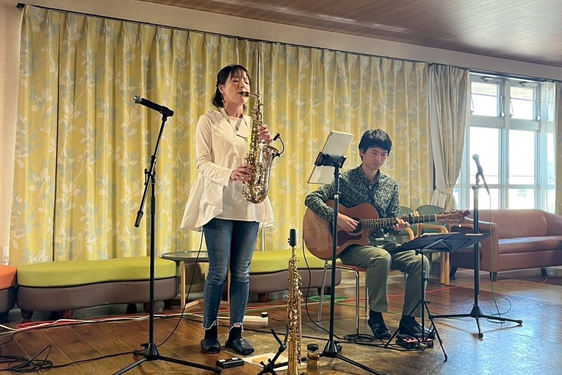 童謡、美空ひばりさんや千昌夫さんなど、利用者様が知ってる曲が流れ、サックスとギターの音色に、利用者様もうっとり(*´꒳`*)